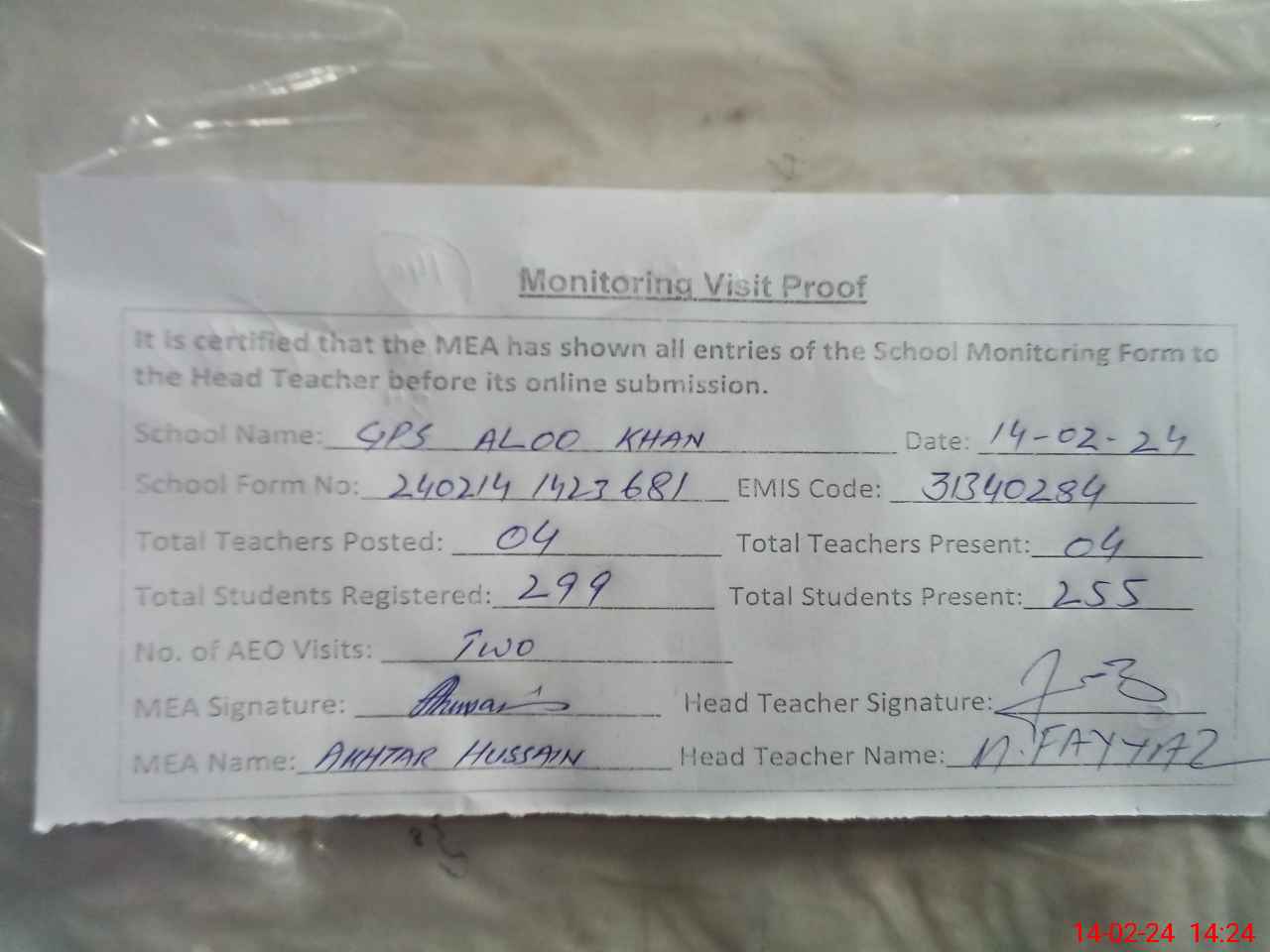 | Attendance Register | Head Teacher | MEA with School | Visit Proof |
