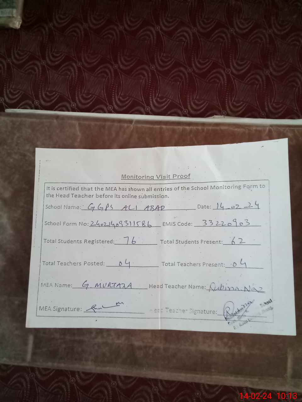 | Attendance Register | Head Teacher | MEA with School | Visit Proof |