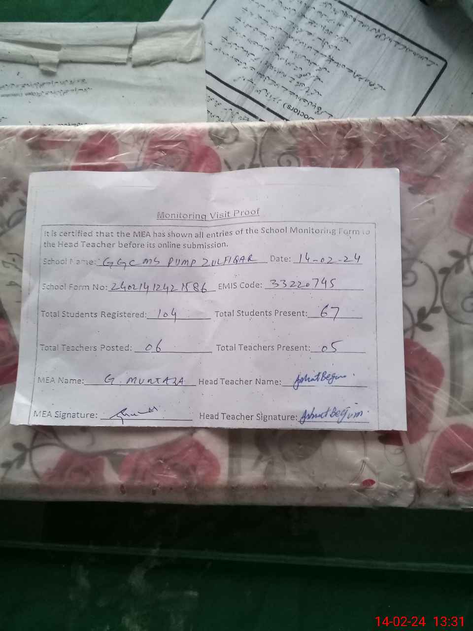| EMIS Code: 33220745 | Name of School: GGCMS PUMP ZULFIQAR | |||