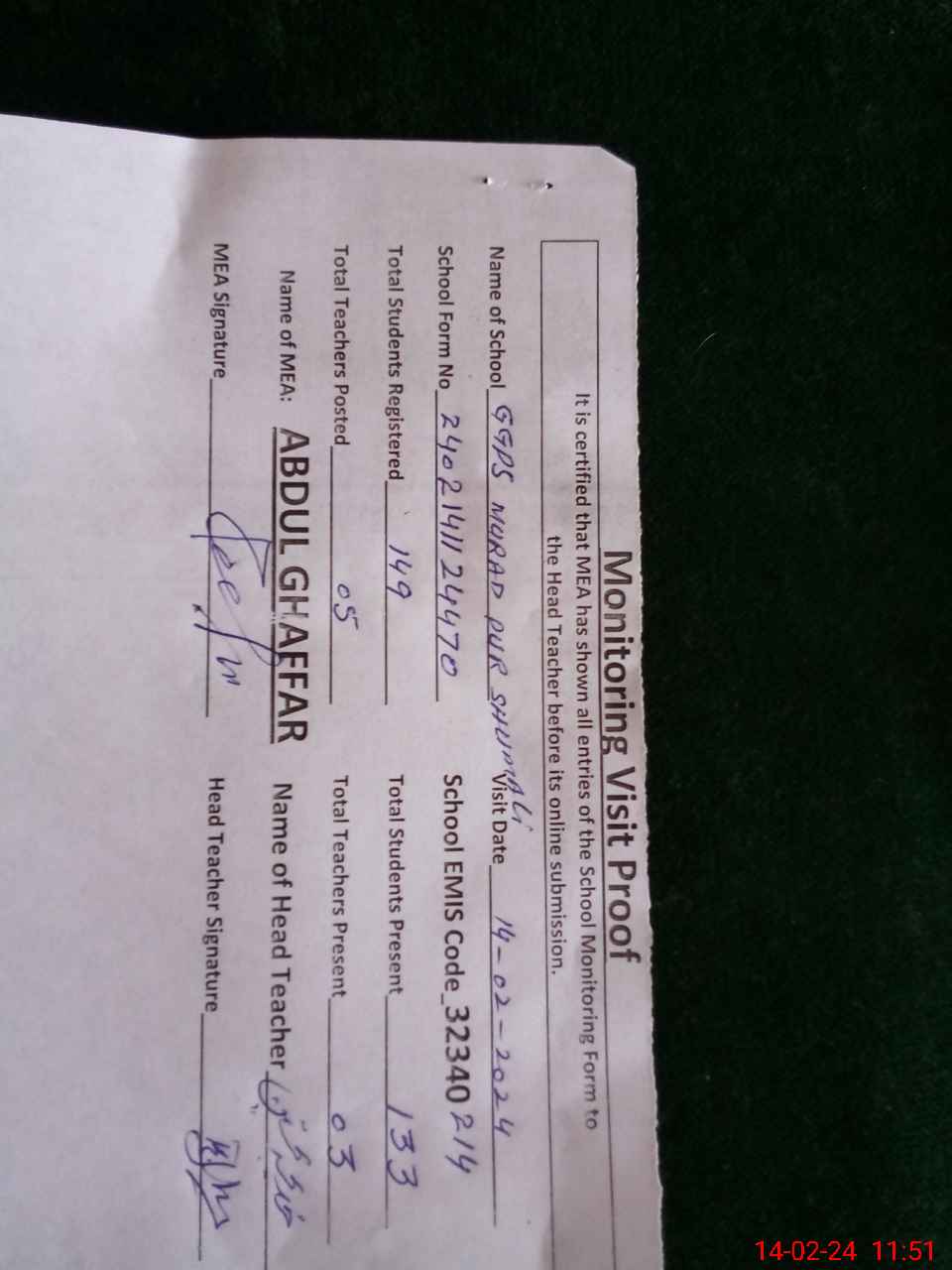| EMIS Code: 32340214 | Name of School: GGPS MURAD PUR SHUMALI | |||