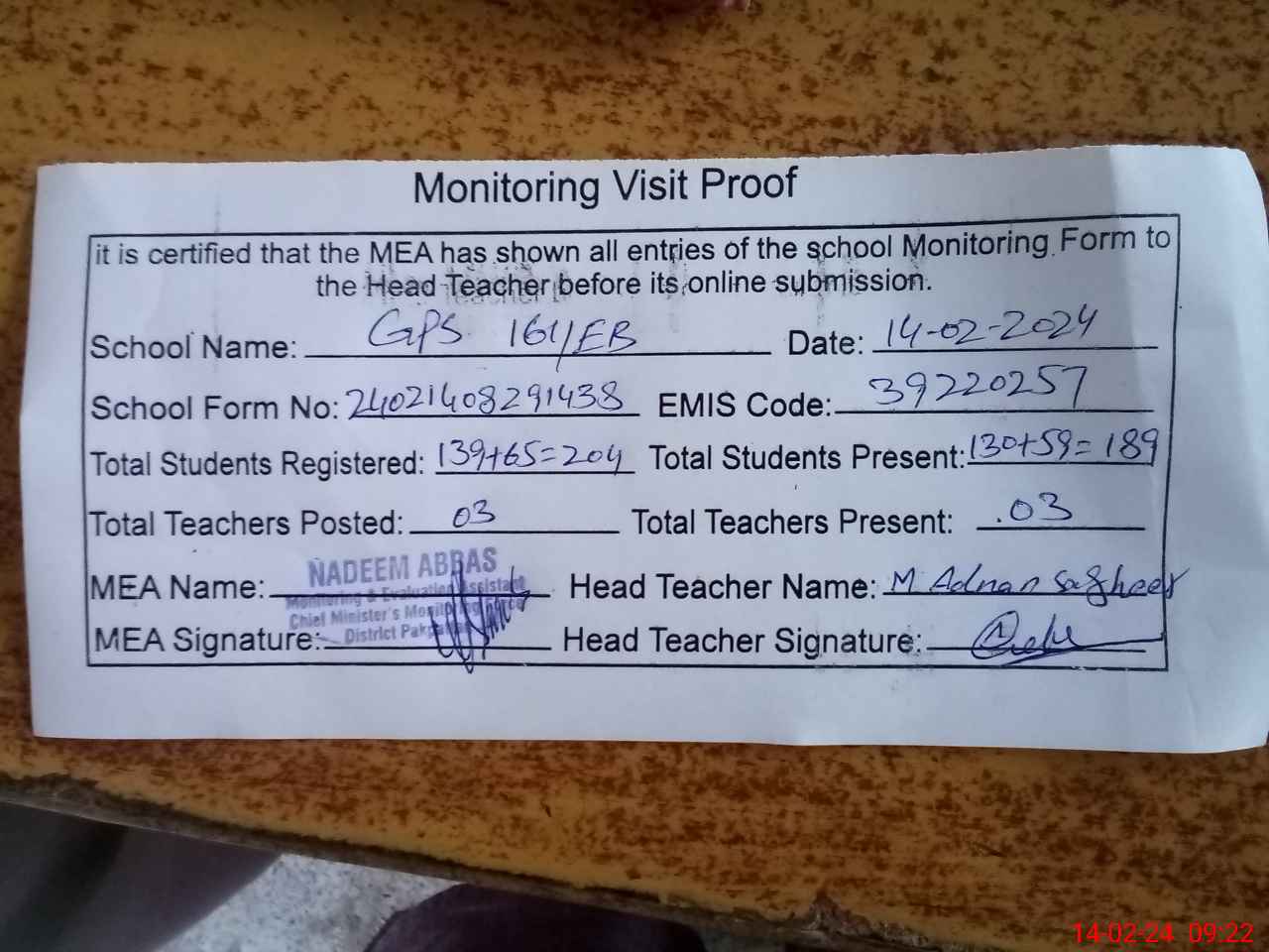 | Attendance Register | Head Teacher | MEA with School | Visit Proof |
