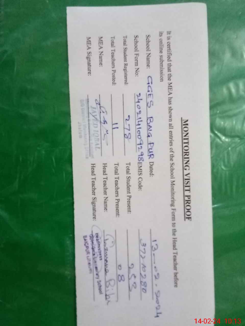 | Name: RI**** BI**** Designation: (School Headmaster's/Headmistress's) Headmaster Phone/Cell Number: 03**** |