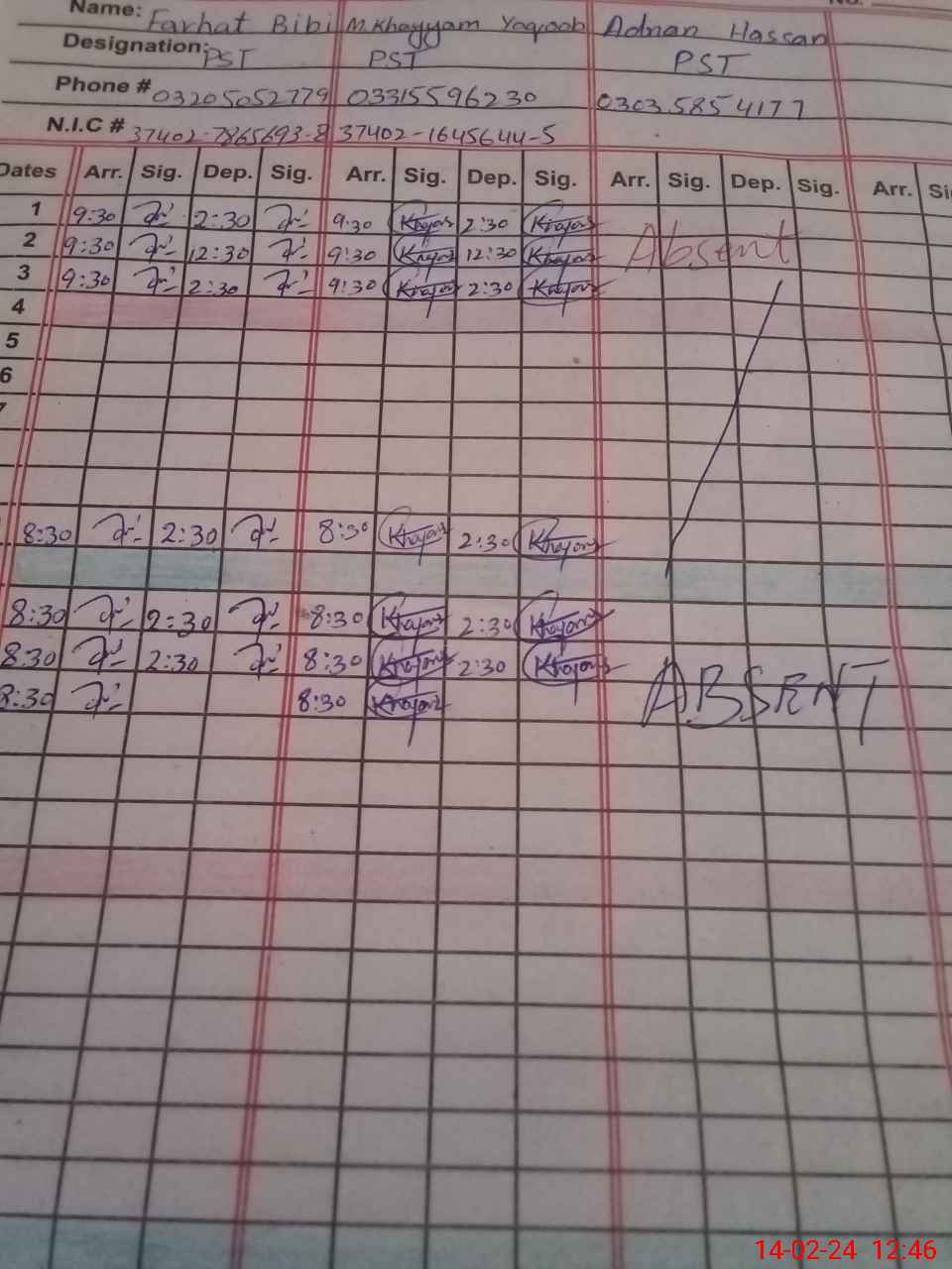| CNIC | Full Name | Designation | R/C | Absence During Last Calender Month |