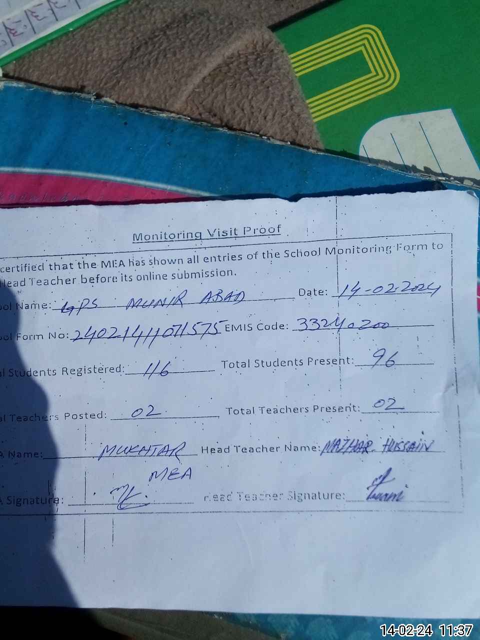 | Attendance Register | Head Teacher | MEA with School | Visit Proof |
