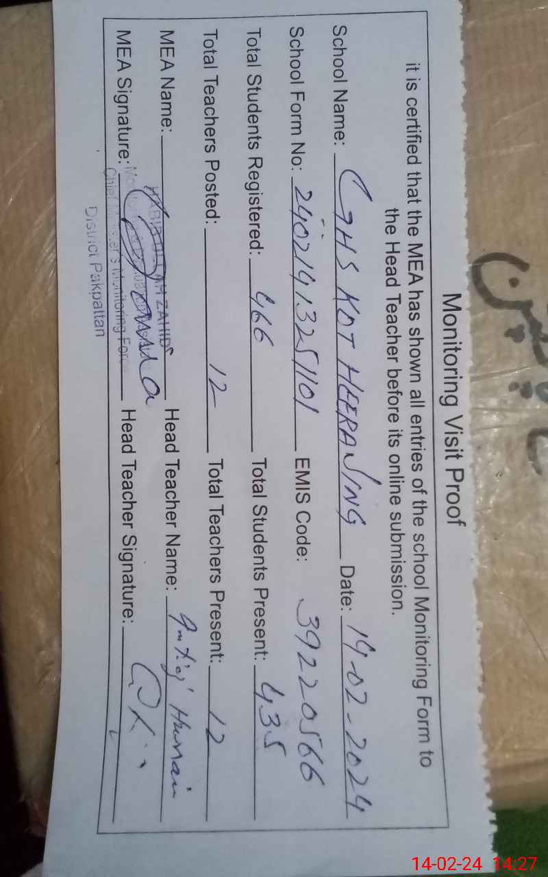 | EMIS Code: 39220566 | Name of School: GHS KOT HEERASINGH P.O SAME | |||