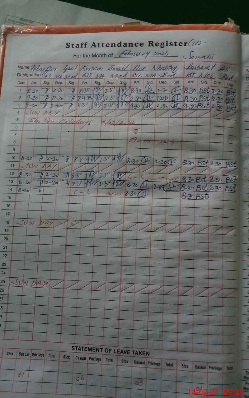 | CNIC | Full Name | Designation | R/C | Absence During Last Calender Month |