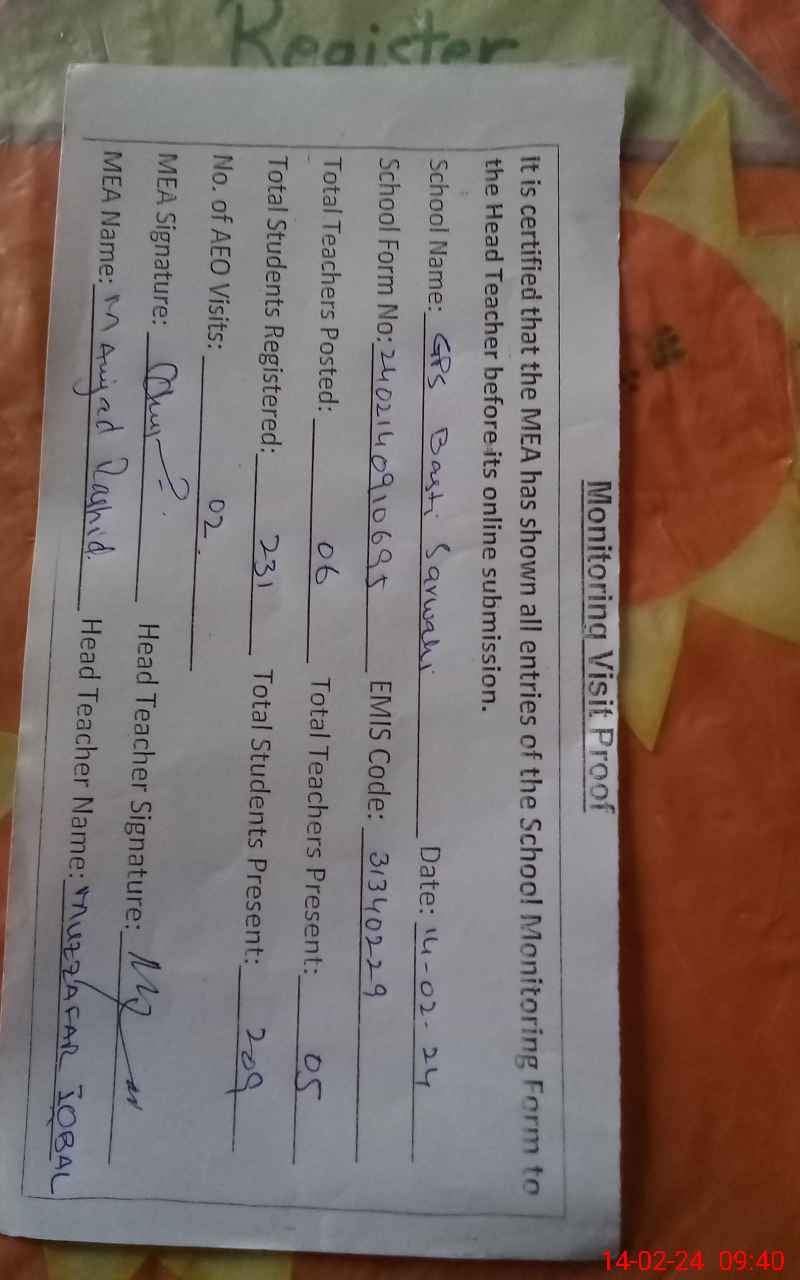 | EMIS Code: 31340229 | Name of School: GPS BASTI SARWAHI | |||