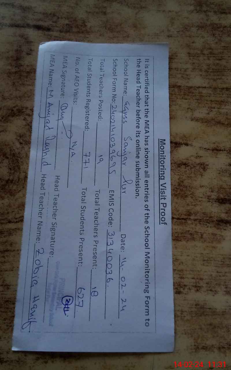 | EMIS Code: 31340036 | Name of School: GGHSS SANJAR PUR | |||
