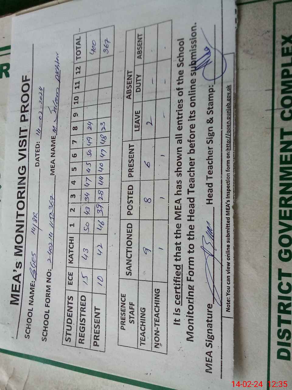 | Certified that this School was Inspected by the Undersigned MEA/DMO Today and the Information Stated Above is as Per Record. | |||||