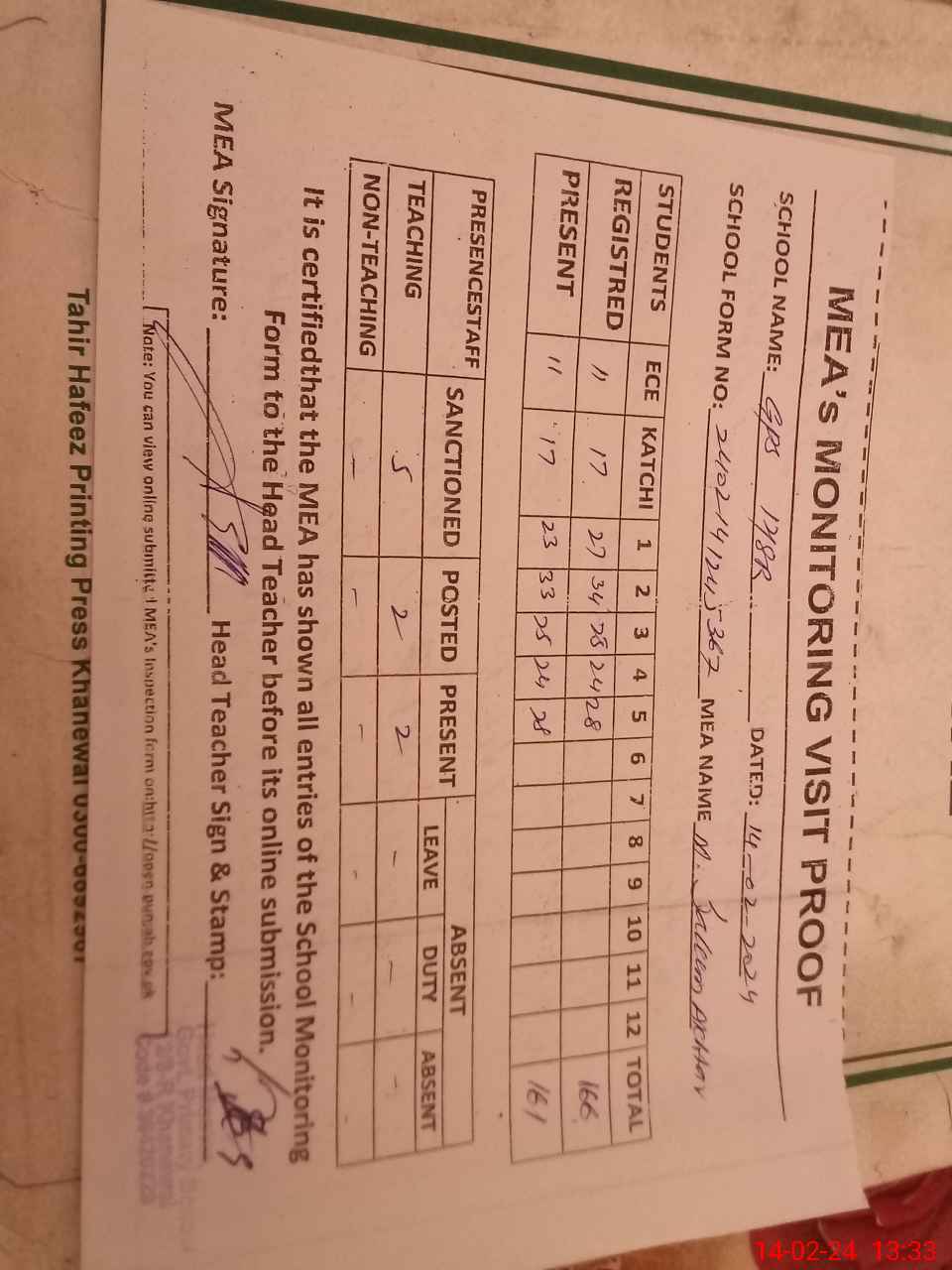 | Certified that this School was Inspected by the Undersigned MEA/DMO Today and the Information Stated Above is as Per Record. | |||||