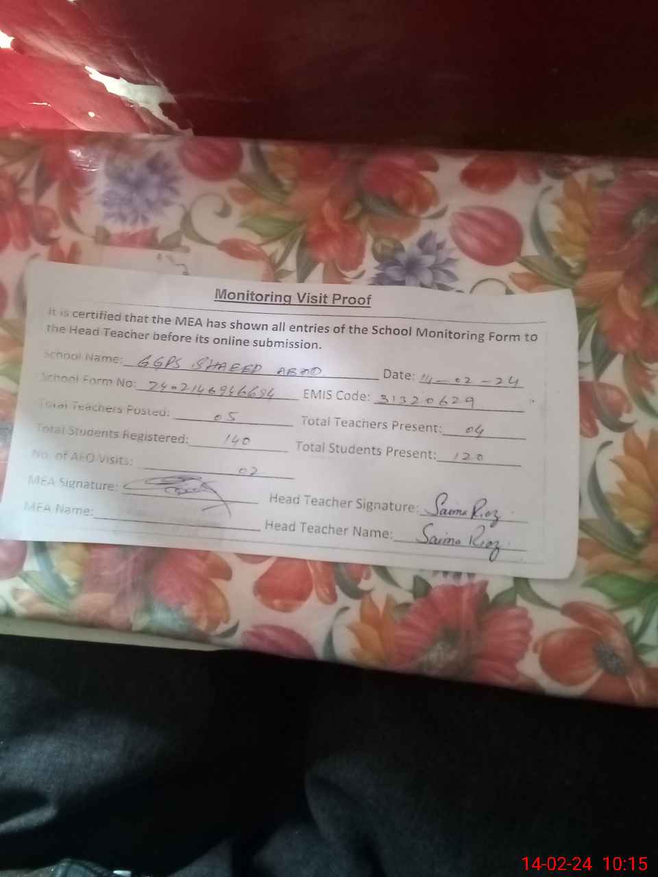 | Attendance Register | Head Teacher | MEA with School | Visit Proof |