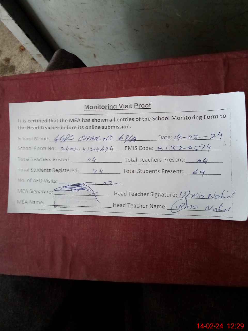 | Attendance Register | Head Teacher | MEA with School | Visit Proof |