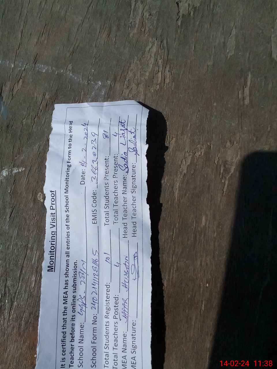 | Attendance Register | Head Teacher | MEA with School | Visit Proof |
