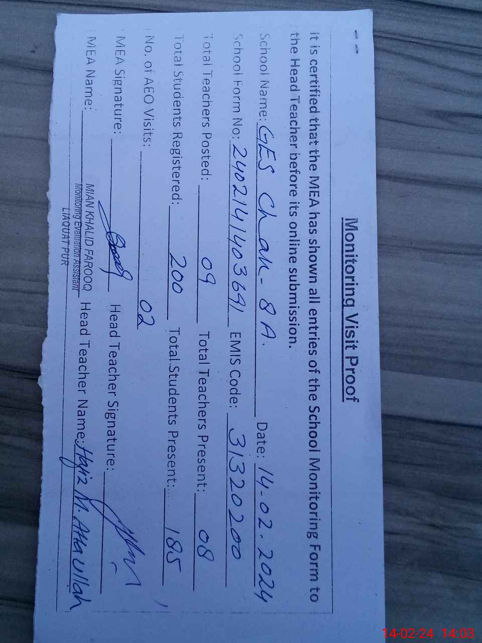 | Attendance Register | Head Teacher | MEA with School | Visit Proof |