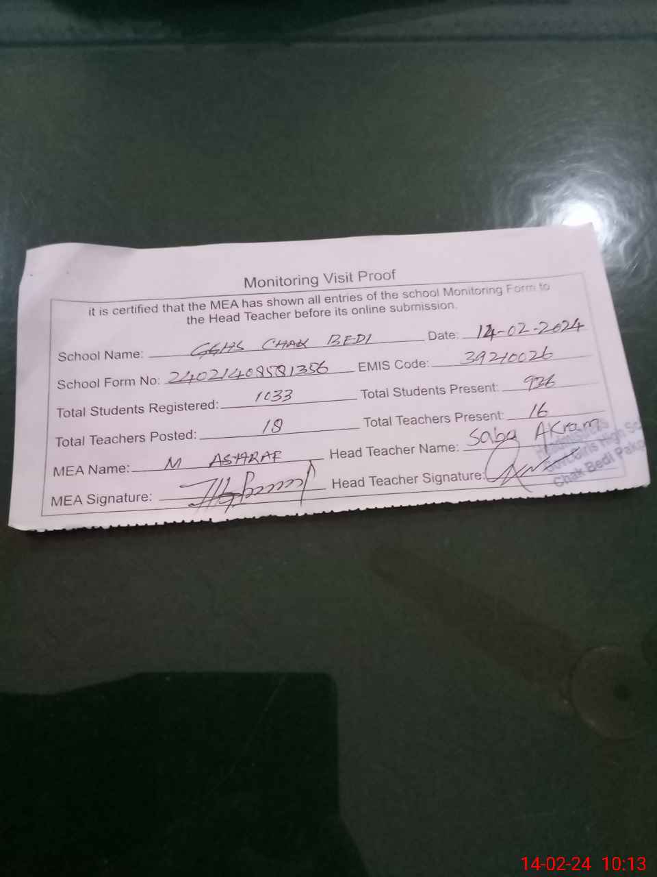 | Certified that this School was Inspected by the Undersigned MEA/DMO Today and the Information Stated Above is as Per Record. | |||||