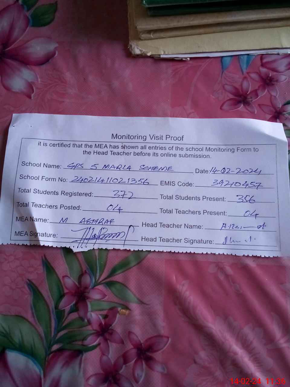 | Attendance Register | Head Teacher | MEA with School | Visit Proof |