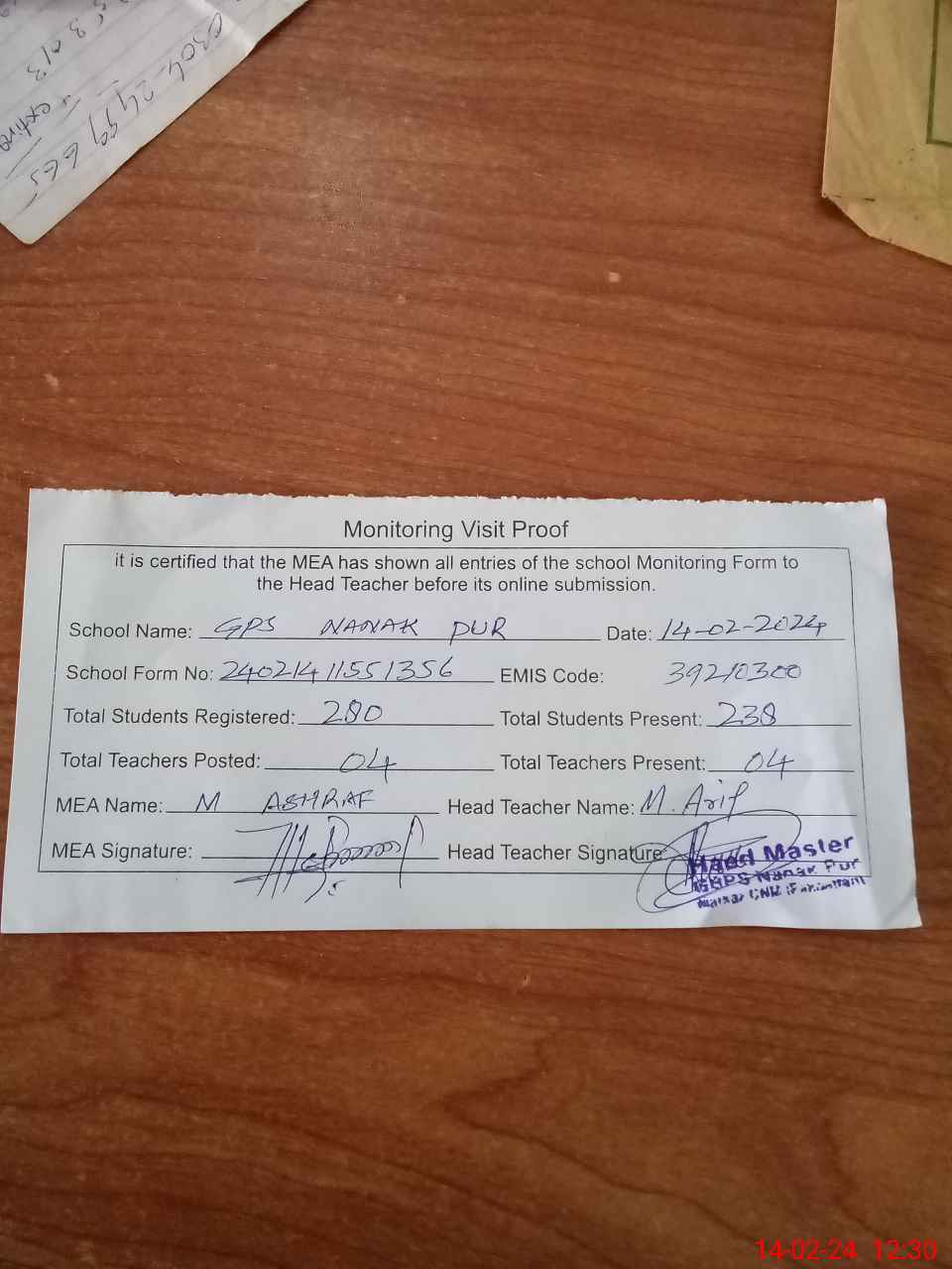 | Attendance Register | Head Teacher | MEA with School | Visit Proof |