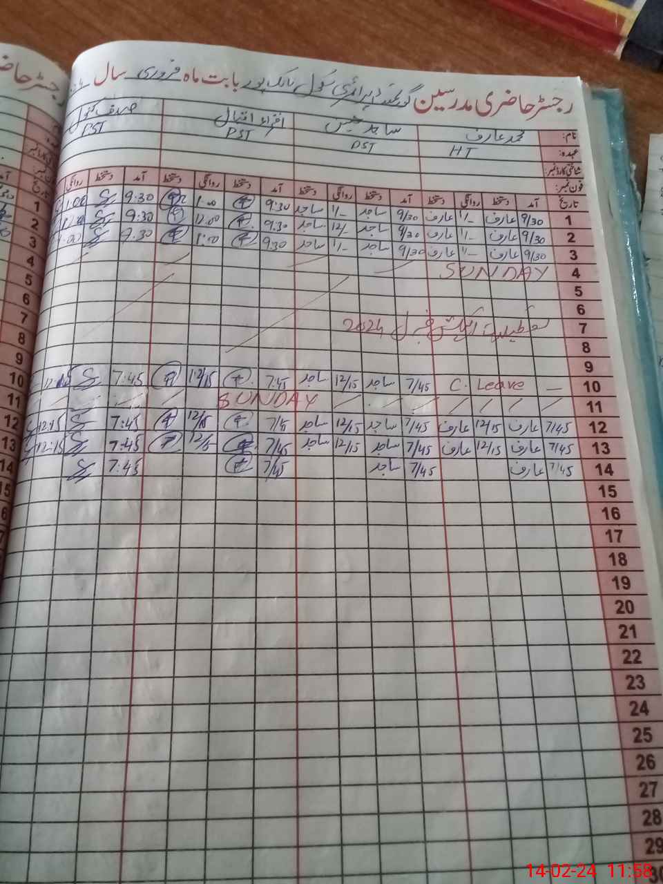 | CNIC | Full Name | Designation | R/C | Absence During Last Calender Month |