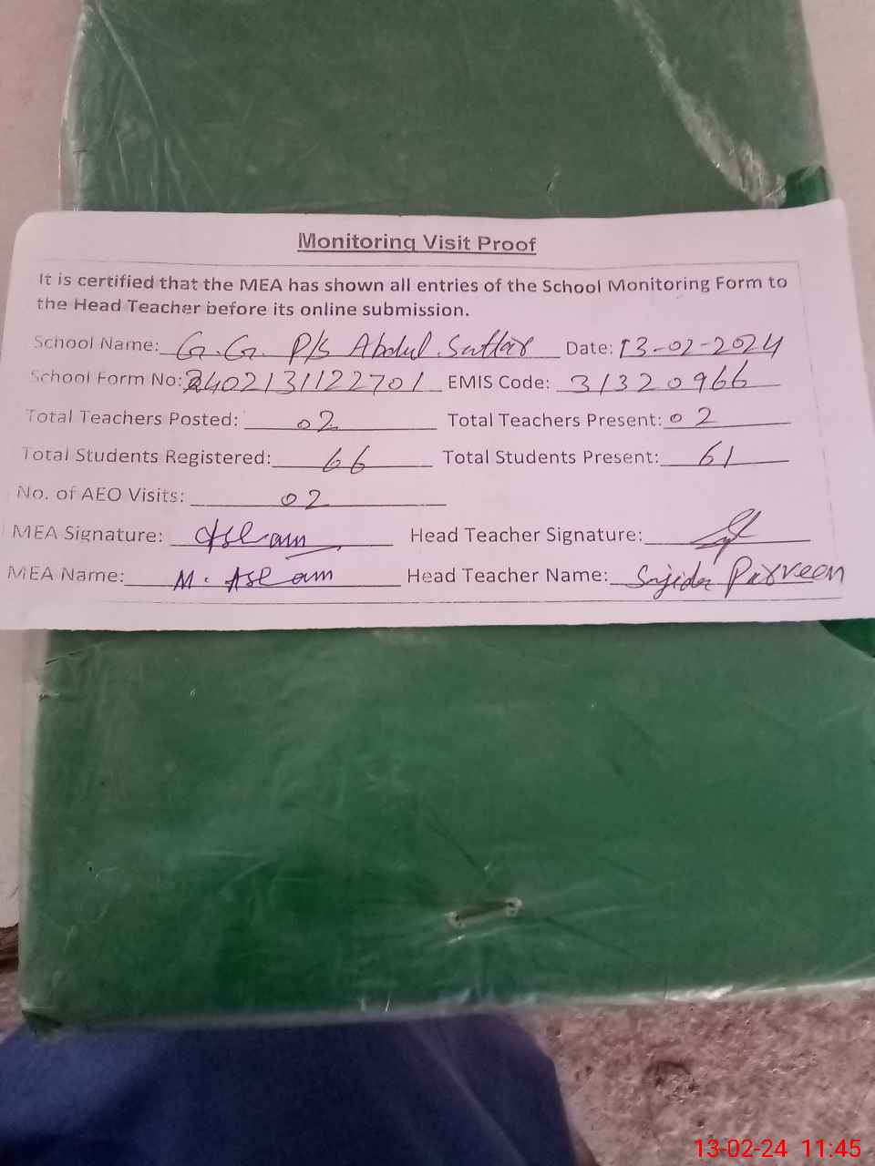 | Attendance Register | Head Teacher | MEA with School | Visit Proof |