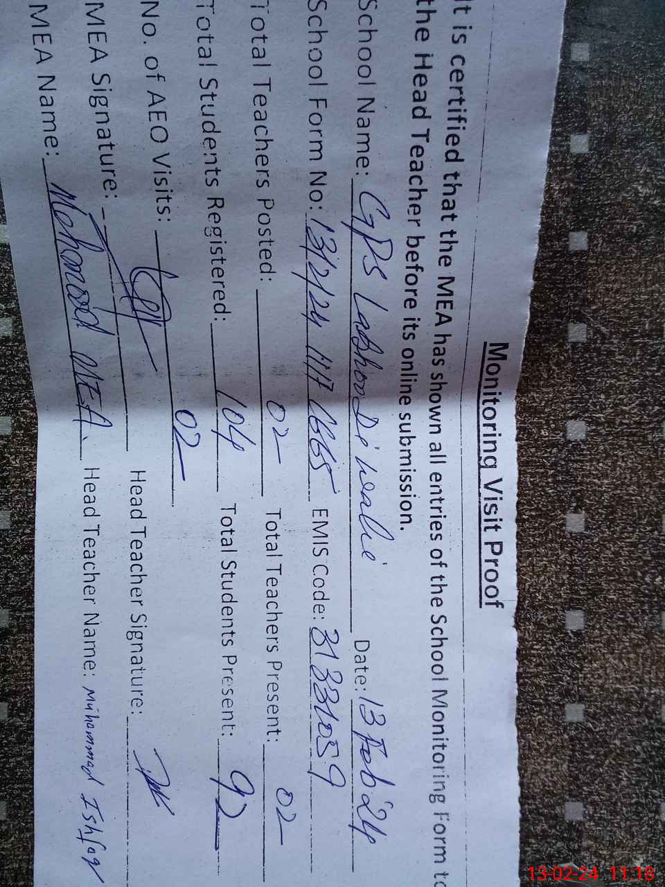 | Attendance Register | Head Teacher | MEA with School | Visit Proof |