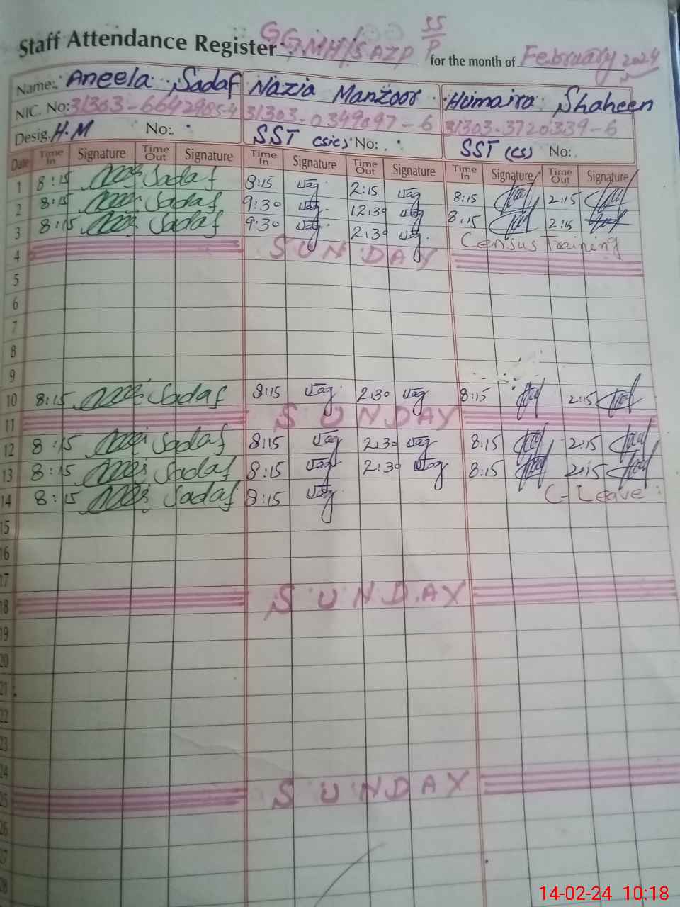 | CNIC | Full Name | Designation | R/C | Absence During Last Calender Month |