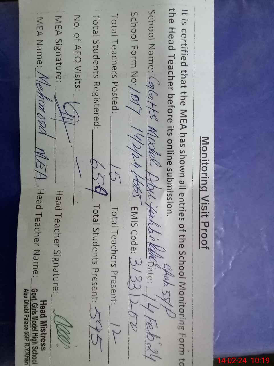 | Certified that this School was Inspected by the Undersigned MEA/DMO Today and the Information Stated Above is as Per Record. | |||||