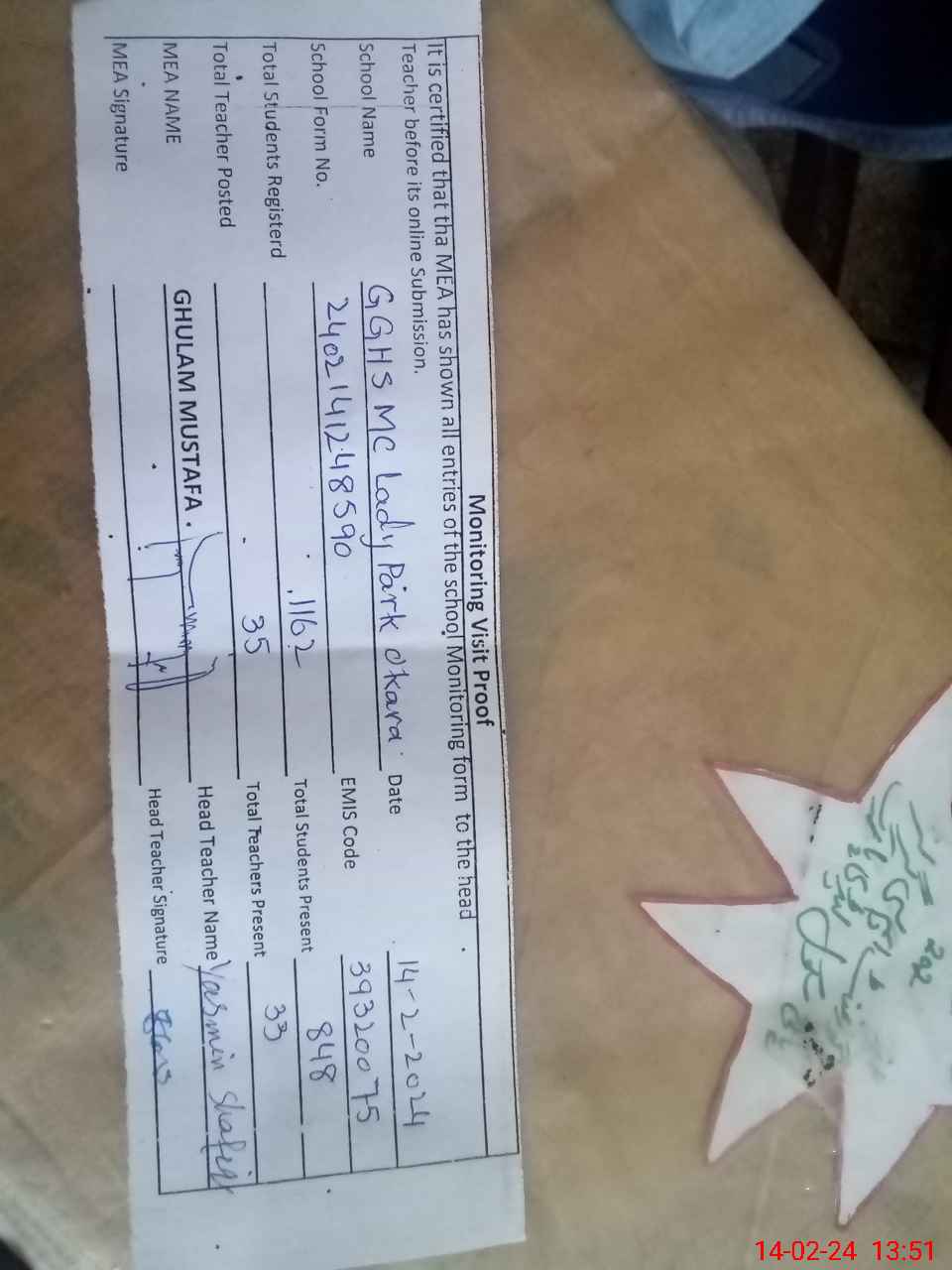 | Certified that this School was Inspected by the Undersigned MEA/DMO Today and the Information Stated Above is as Per Record. | |||||