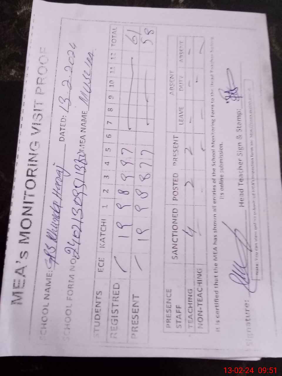 | Attendance Register | Head Teacher | MEA with School | Visit Proof |