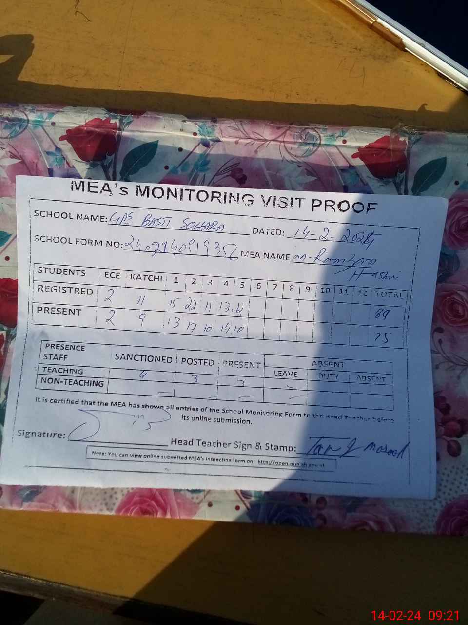 | Certified that this School was Inspected by the Undersigned MEA/DMO Today and the Information Stated Above is as Per Record. | |||||