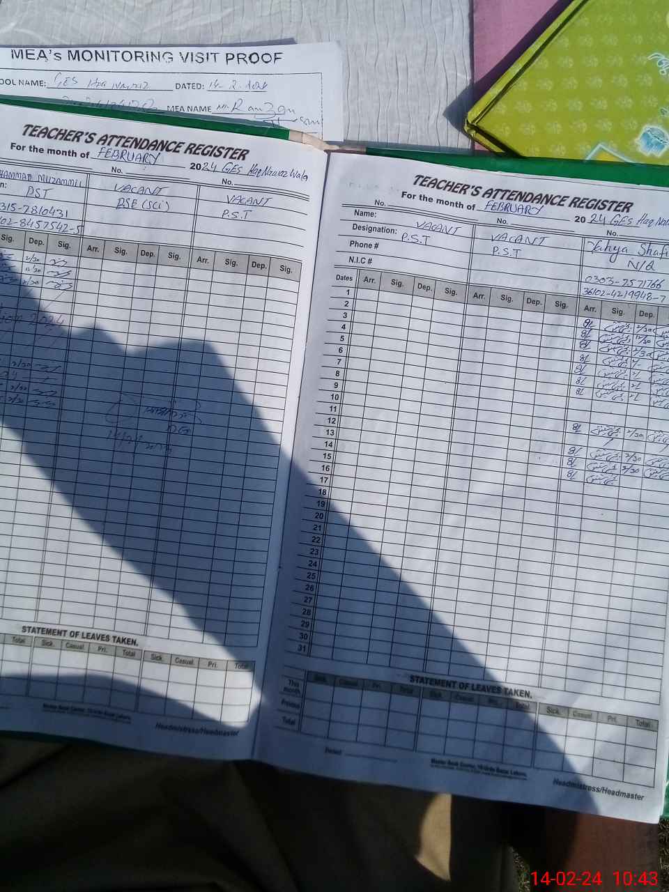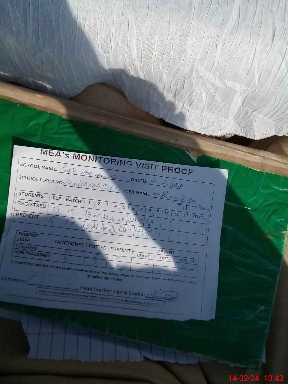 | Attendance Register | Head Teacher | MEA with School | Visit Proof |