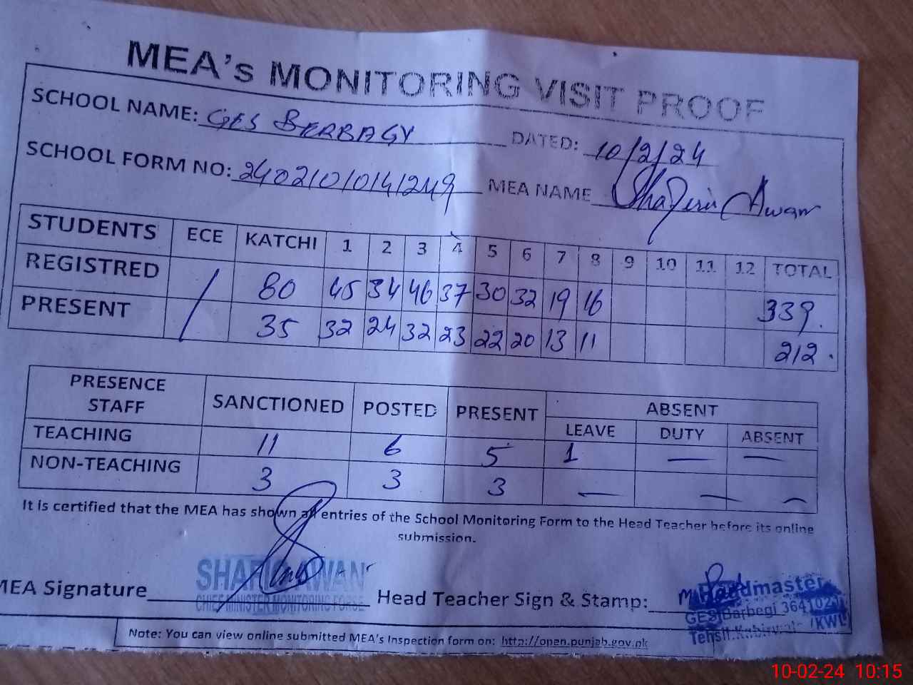 | Attendance Register | Head Teacher | MEA with School | Visit Proof |