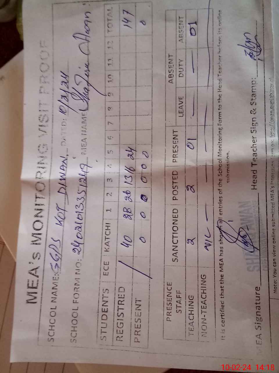 | Certified that this School was Inspected by the Undersigned MEA/DMO Today and the Information Stated Above is as Per Record. | |||||