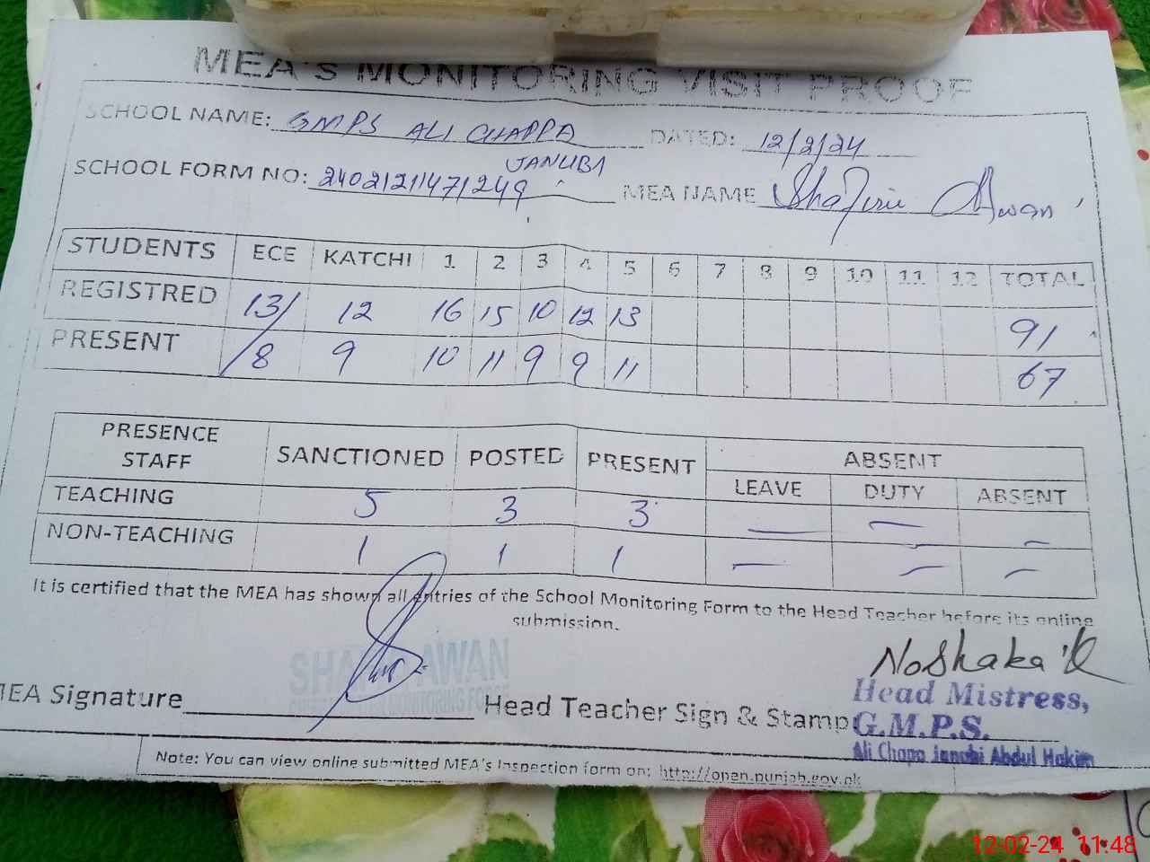 | Certified that this School was Inspected by the Undersigned MEA/DMO Today and the Information Stated Above is as Per Record. | |||||