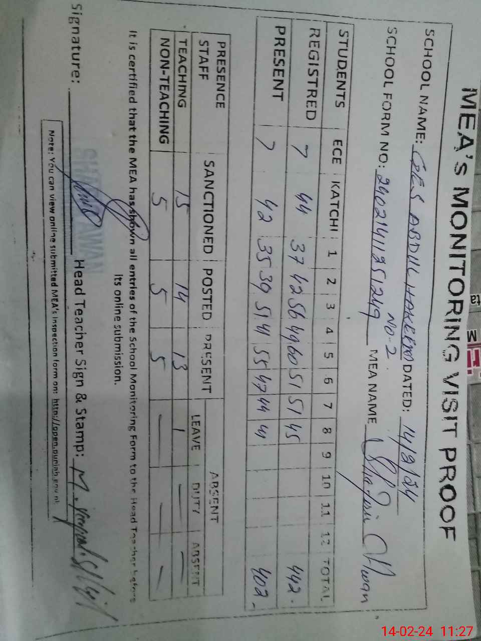 | Certified that this School was Inspected by the Undersigned MEA/DMO Today and the Information Stated Above is as Per Record. | |||||