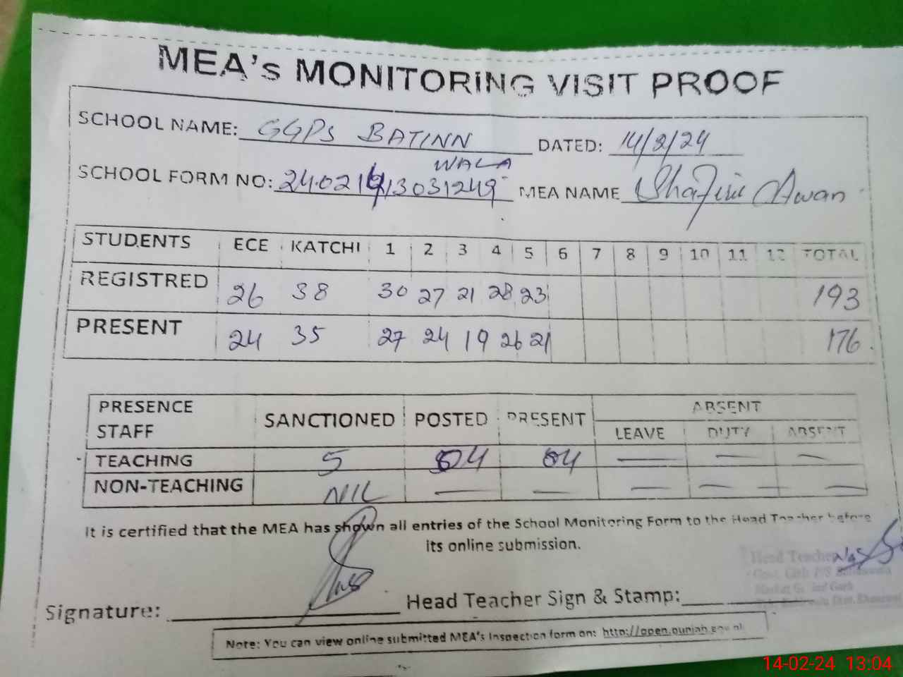 | Attendance Register | Head Teacher | MEA with School | Visit Proof |
