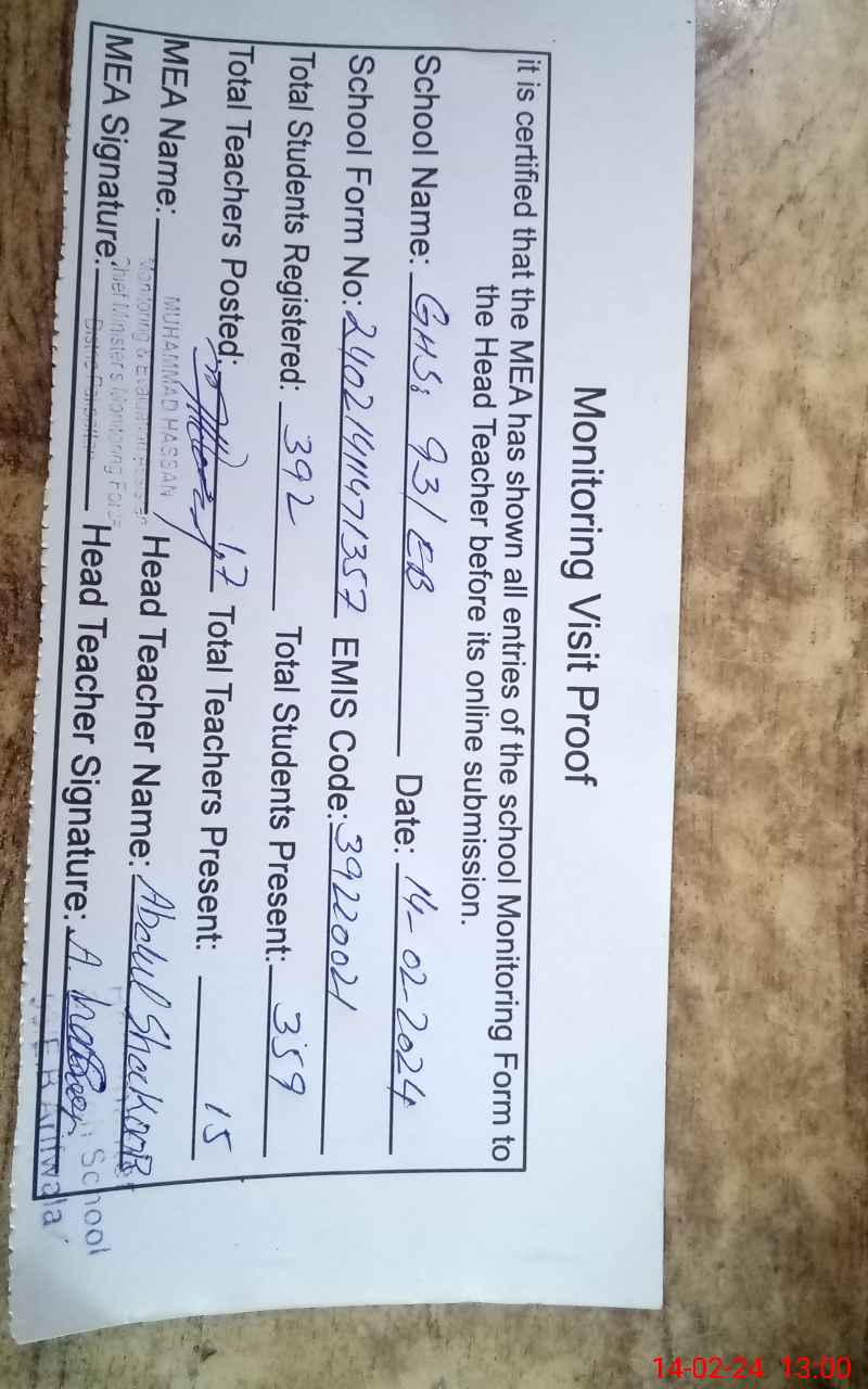 | EMIS Code: 39220021 | Name of School: GHS 93/E-B TEH ARIF WALA | |||