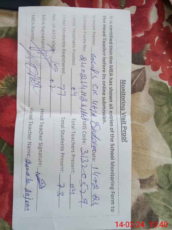 | Certified that this School was Inspected by the Undersigned MEA/DMO Today and the Information Stated Above is as Per Record. | |||||