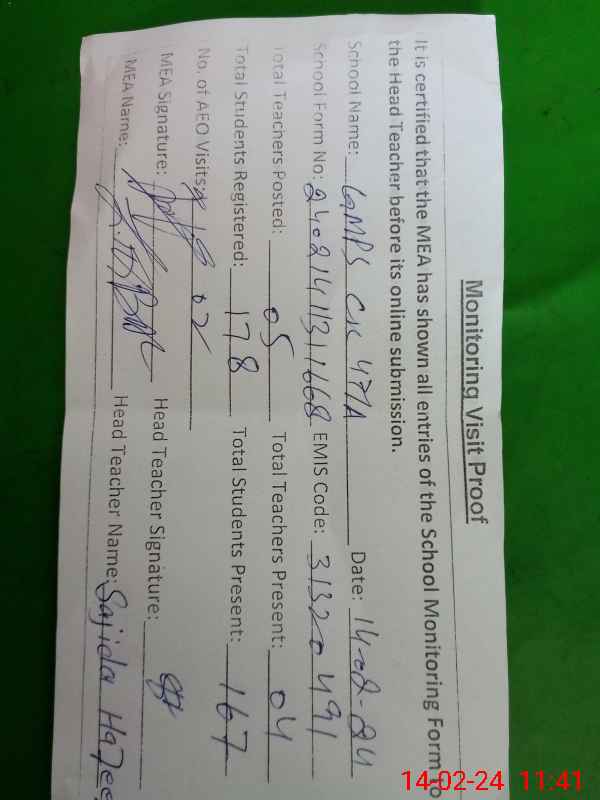 | Certified that this School was Inspected by the Undersigned MEA/DMO Today and the Information Stated Above is as Per Record. | |||||