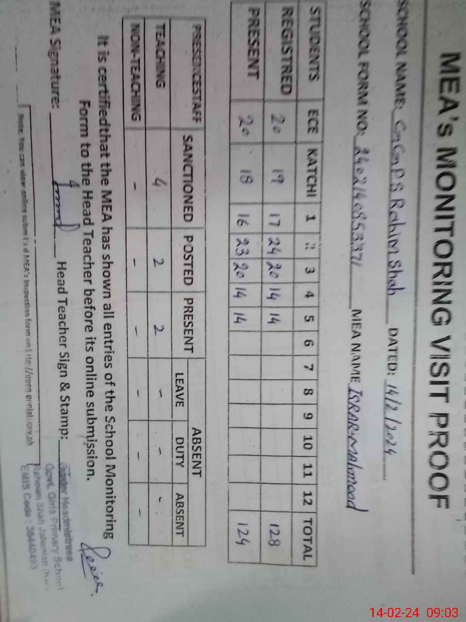 | Attendance Register | Head Teacher | MEA with School | Visit Proof |