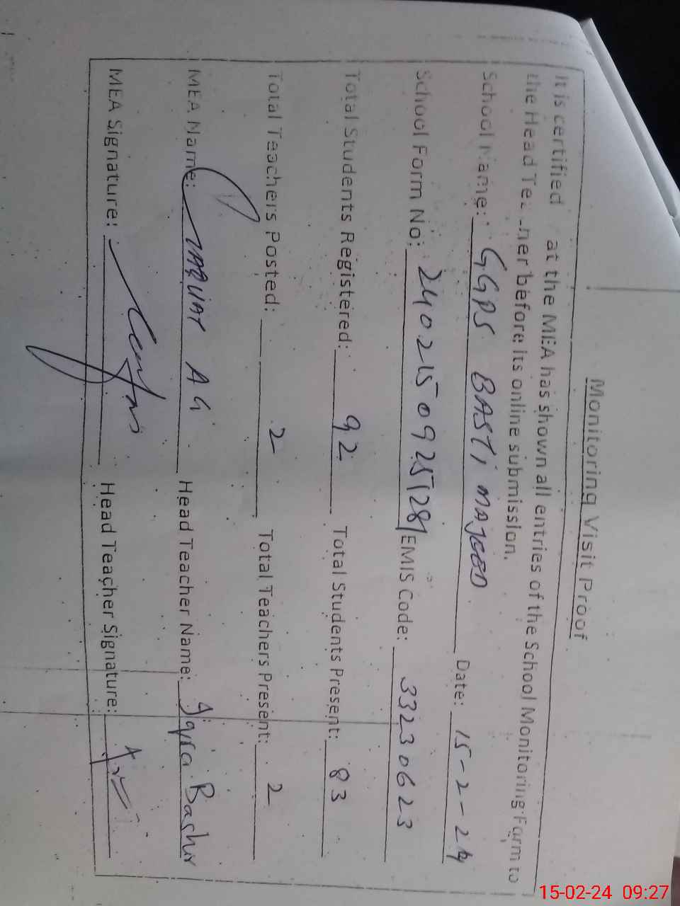 | EMIS Code: 33230623 | Name of School: GGPS BASTI MAJEED GOHAR | |||