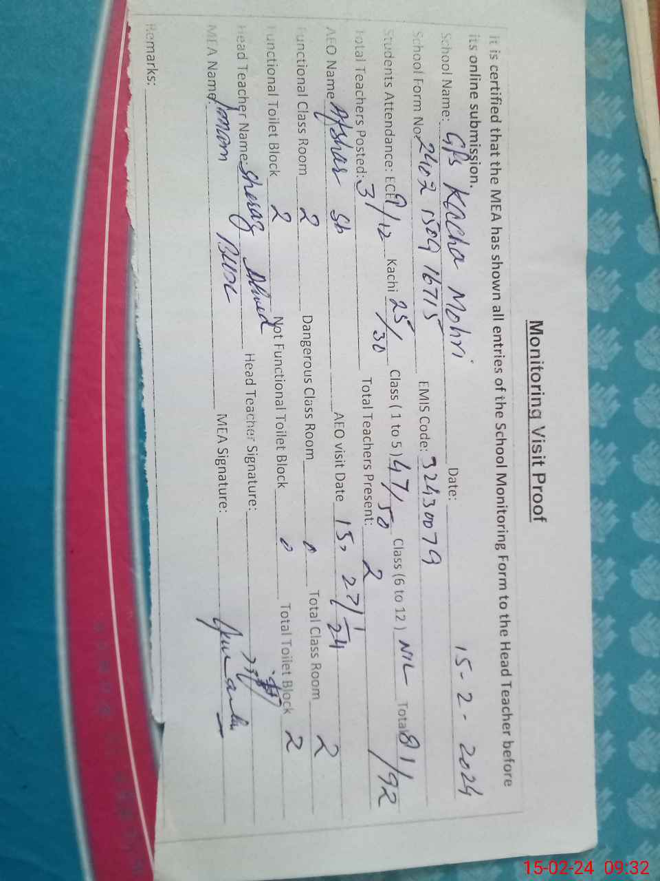 | EMIS Code: 32430079 | Name of School: GPS KACHA MOHRI | |||