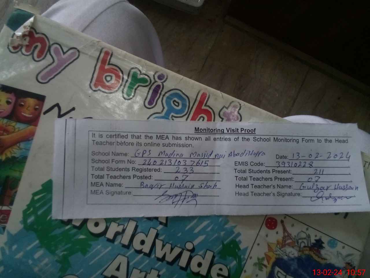 | Attendance Register | Head Teacher | MEA with School | Visit Proof |