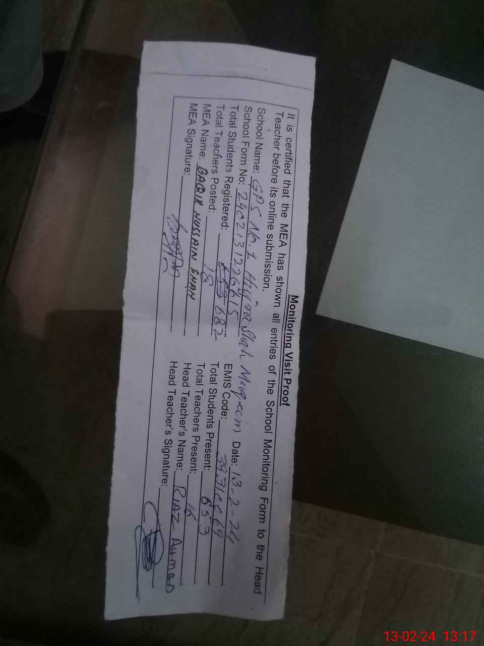 | Attendance Register | Head Teacher | MEA with School | Visit Proof |