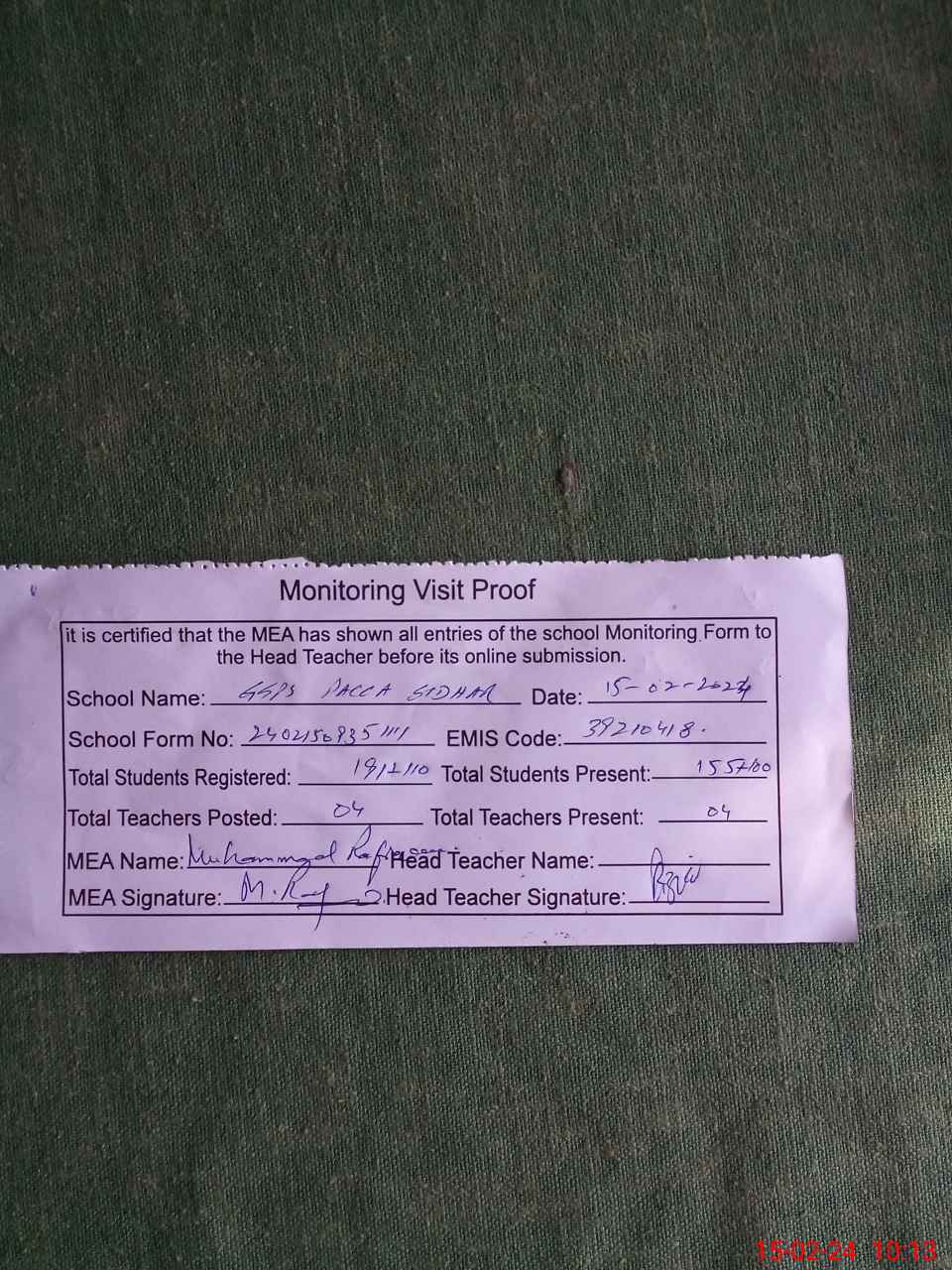 | Attendance Register | Head Teacher | MEA with School | Visit Proof |
