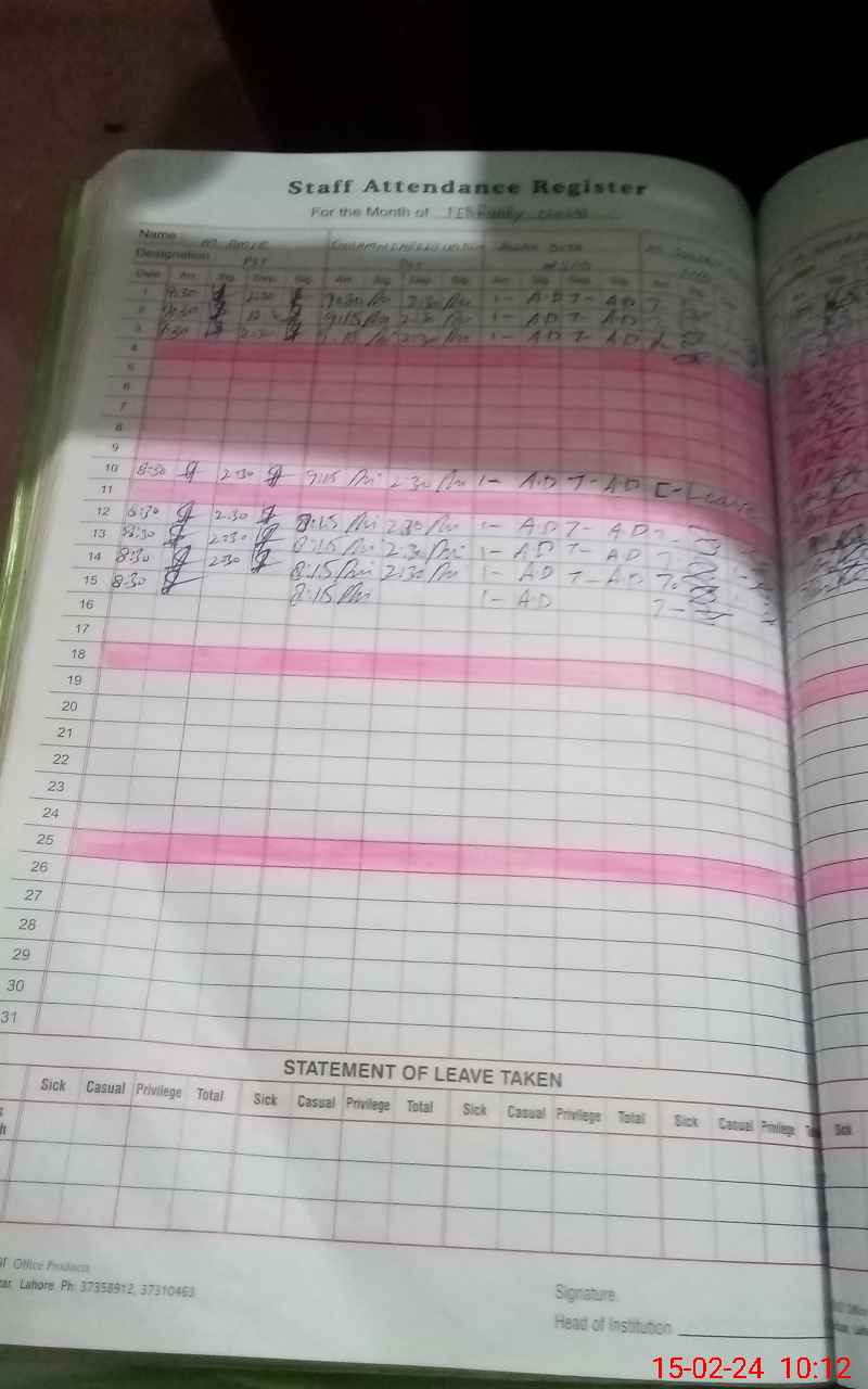 | CNIC | Full Name | Designation | R/C | Absence During Last Calender Month |