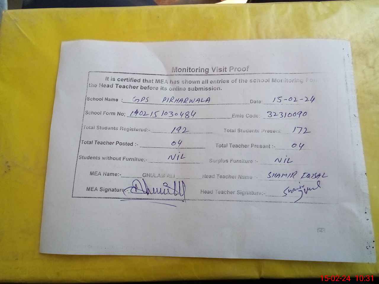| EMIS Code: 32310090 | Name of School: GPS PIRHAR WALA | |||