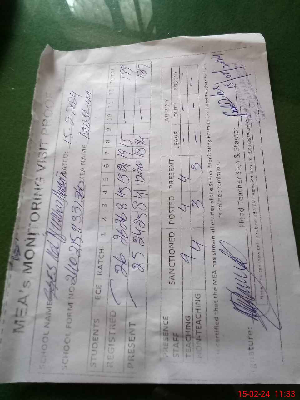 | Attendance Register | Head Teacher | MEA with School | Visit Proof |