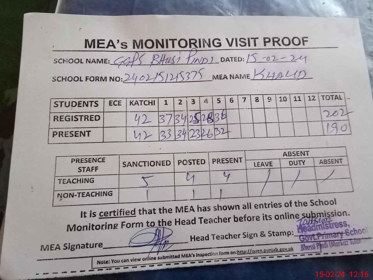 | Attendance Register | Head Teacher | MEA with School | Visit Proof |