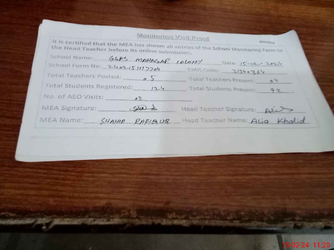 | Attendance Register | Head Teacher | MEA with School | Visit Proof |