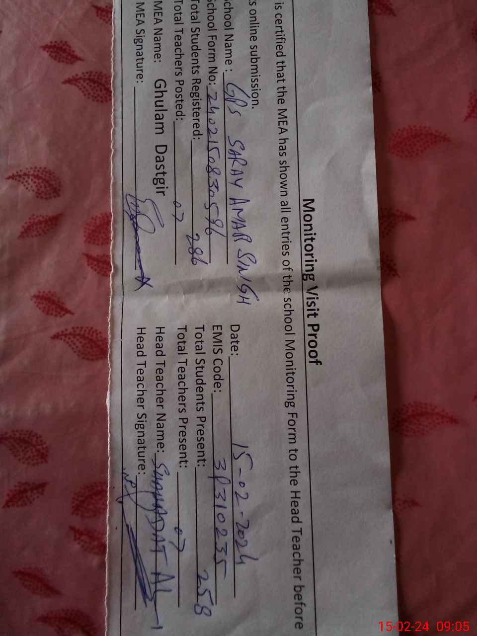 | Attendance Register | Head Teacher | MEA with School | Visit Proof |
